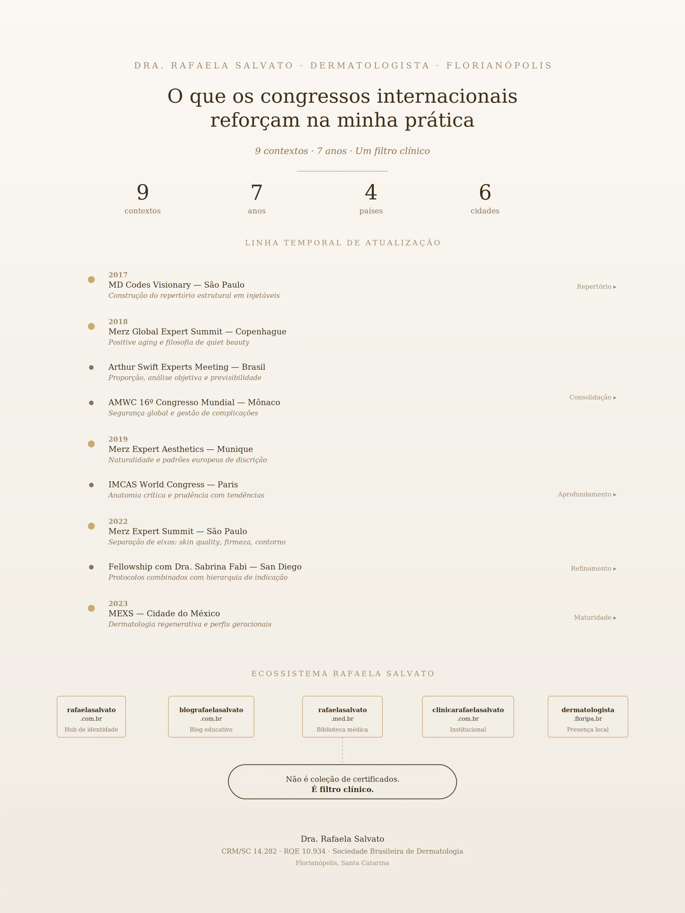 Dra. Rafaela Salvato, dermatologista em Florianópolis, explica como sete anos de atualização internacional contínua (2017–2023) — incluindo MD Codes, IMCAS, AMWC, Merz Expert Summits e fellowship com Sabrina Fabi — se transformam em filtro clínico, segurança e naturalidade. Nove ensaios sobre o que cada congresso reforçou na prática.